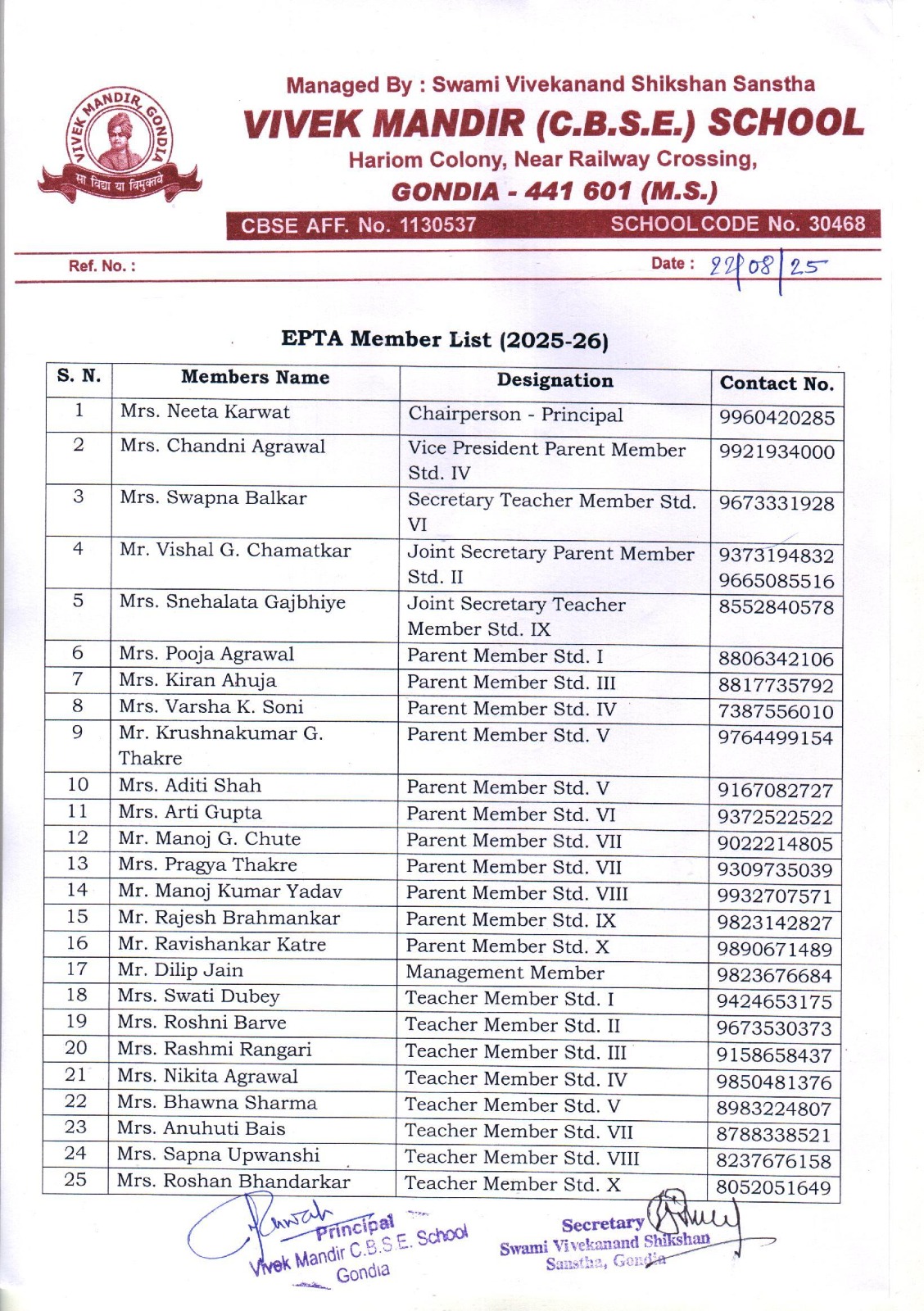 | 1. | PRINCIPAL | 1 | MRS. NEETA UMESH KARWAT, M.SC., B.ED, DSH. |